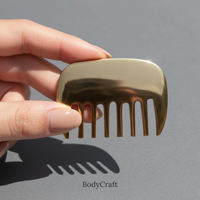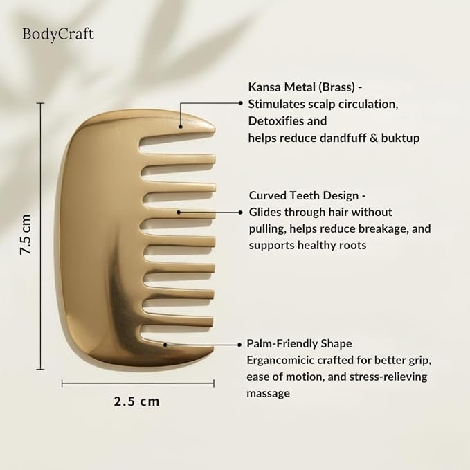- TRADITIONAL AYURVEDIC DESIGN: Wide-toothed Kansa metal comb crafted in bronze finish, designed for therapeutic scalp massage and hair care following ancient wellness practices